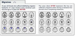 مثال اول : تصویر بالا مربوط به  اسکن خانم34 ساله ای  است که از 15 سالگی در هر سیکل ماهانه ، 5 روز از سردرد میگرنی رنج می برد.همین خانم بعد از درمان کامل چه در دوران پریودی و چه در بین سیکل های ماهانه اش حتی یک مرتبه هم از میگرن رنج نبرد.